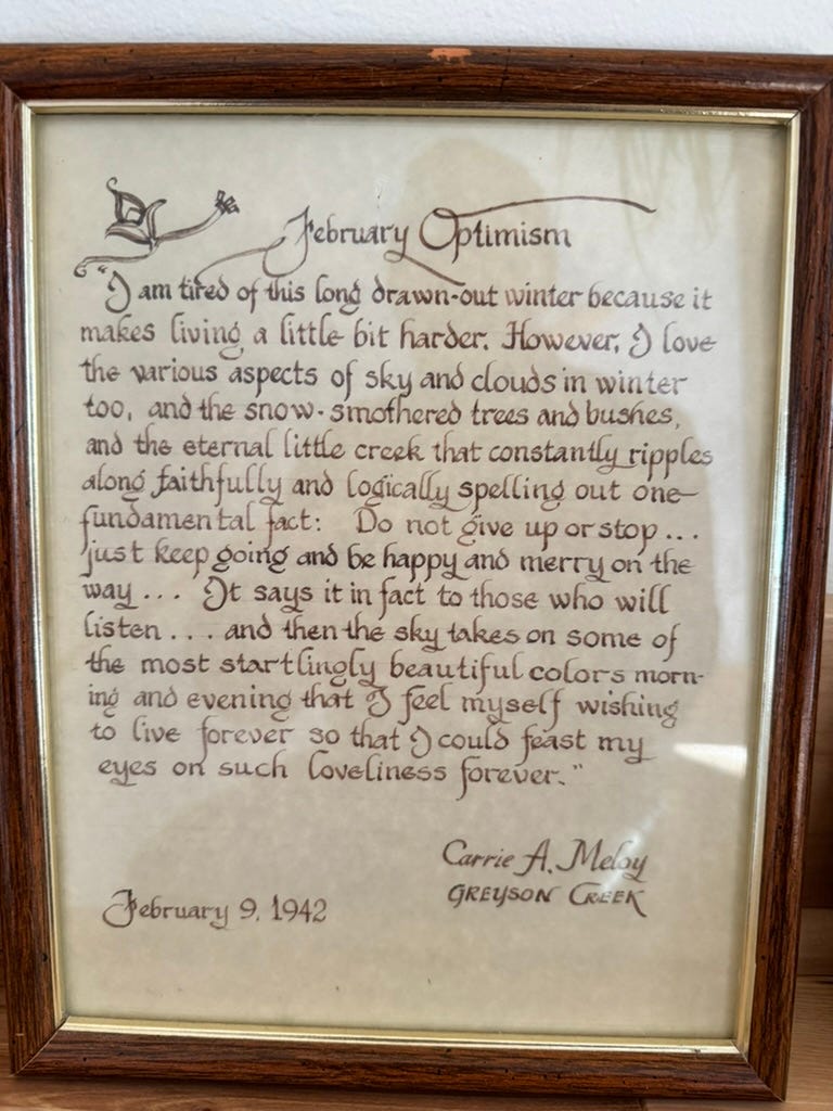 This was written by my great grandmother, Carrie Meloy, as put down in calligraphy by my grandmother Harriett, her daughter-in-law. It’s from her journals. Carrie was living on a ranch near Townsend, MT when she wrote it. I imagine winter on a ranch in central Montana in the 40s could be dreary stuff. When she says it “makes living a little bit harder,” I can only imagine what kind of hardships those might be. How would they compare to our February hardships in 2026? I doubt they had indoor plumbing, there on the ranch, and I bet it was very cold. I bet they had to go break up ice from the water in the water troughs and fetch wood for a woodstove in freezing temperatures. But even in the midst of what was likely very tough living, she managed to find beauty in the world. She saw reasons for persevering in the way the creek ran.